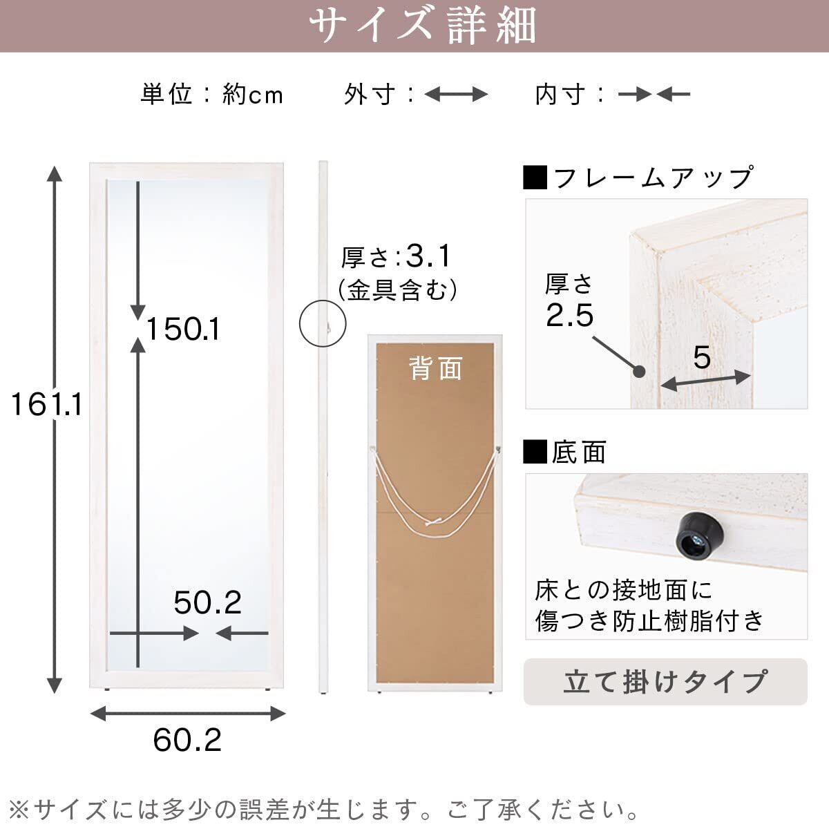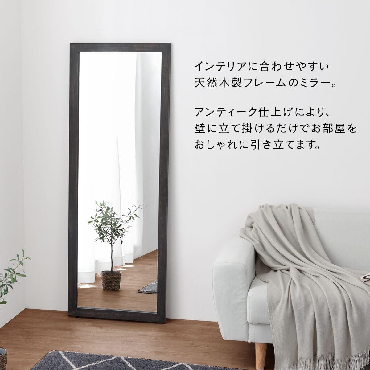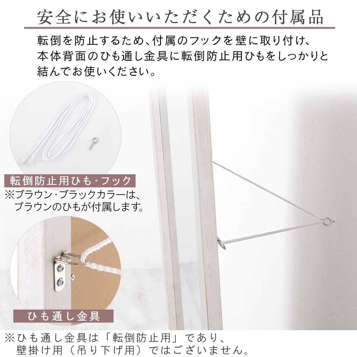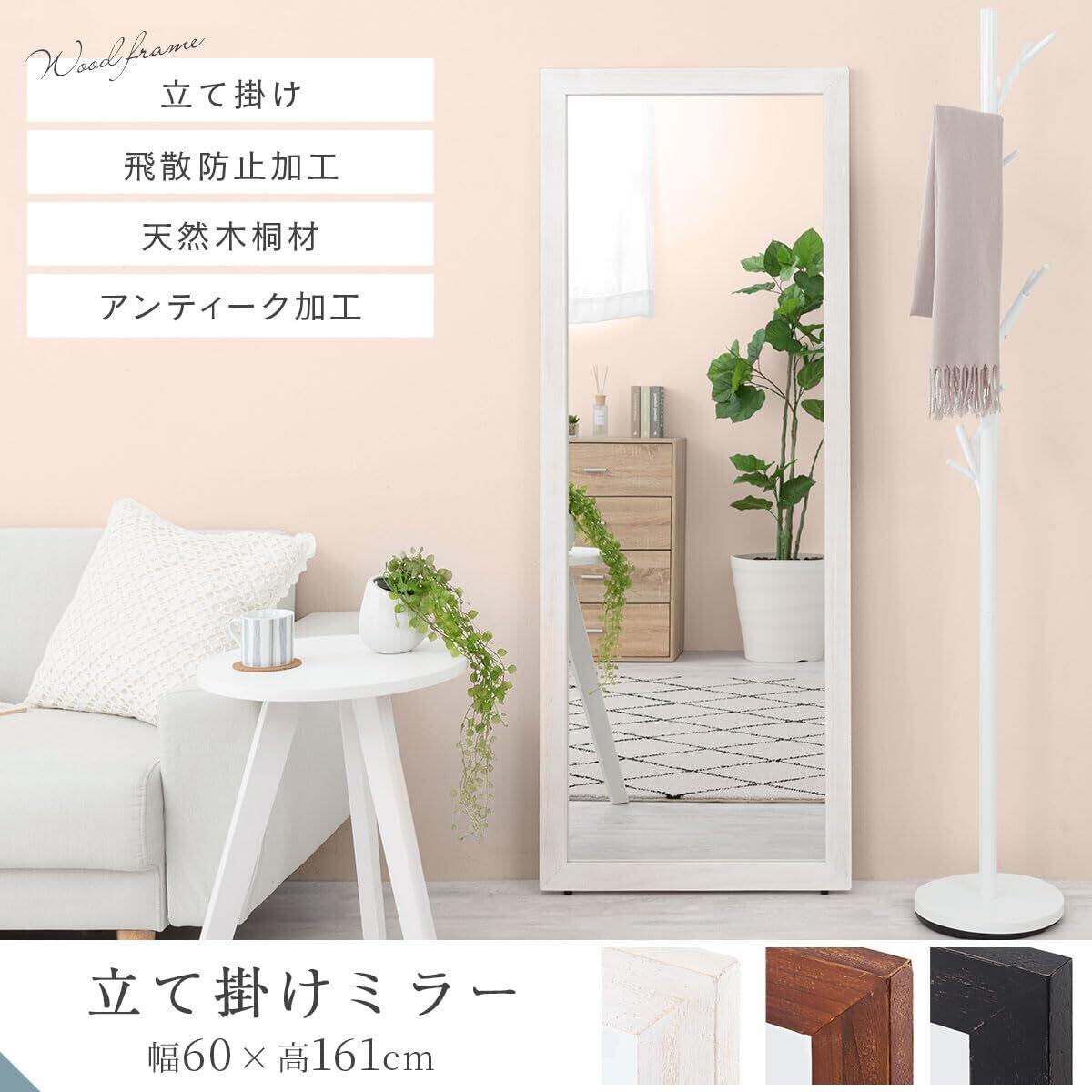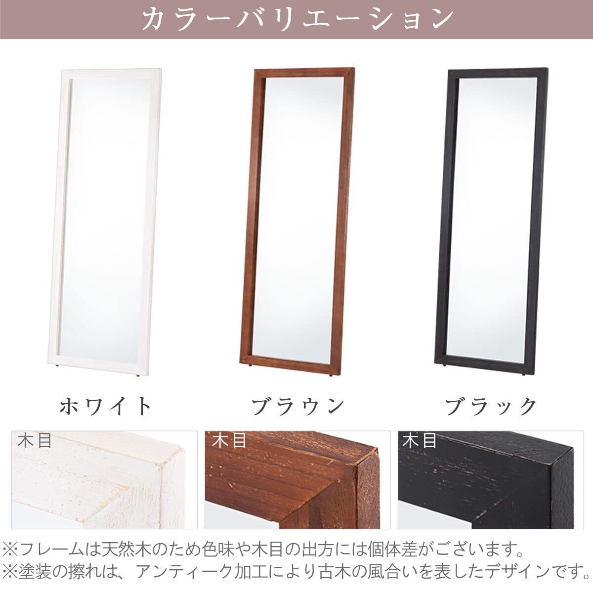 ぼん家具 全身鏡 姿見 全身 大型 ミラー 立て掛け スタンドミラー アンティーク風 幅60cm 高さ161cm 鏡 天然木 リビング 飛散防止 ホワイト