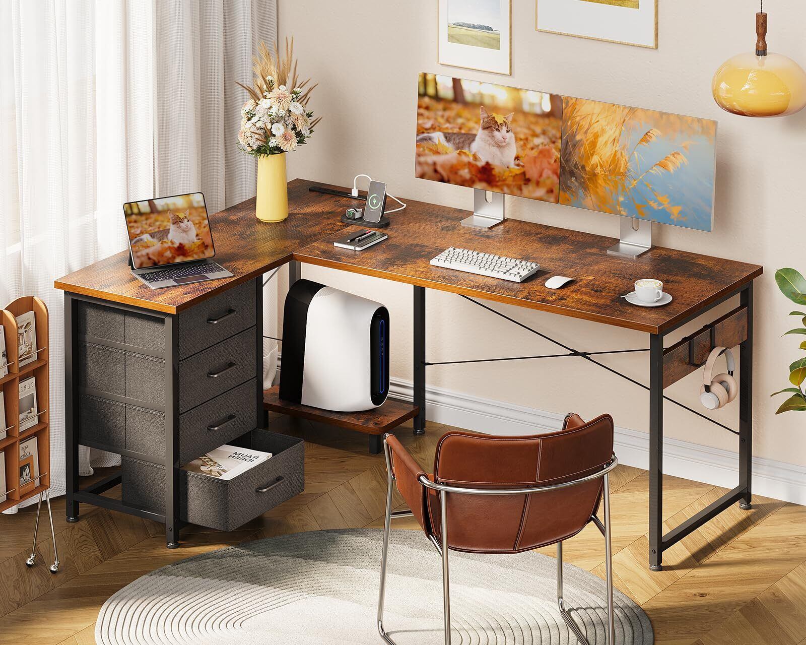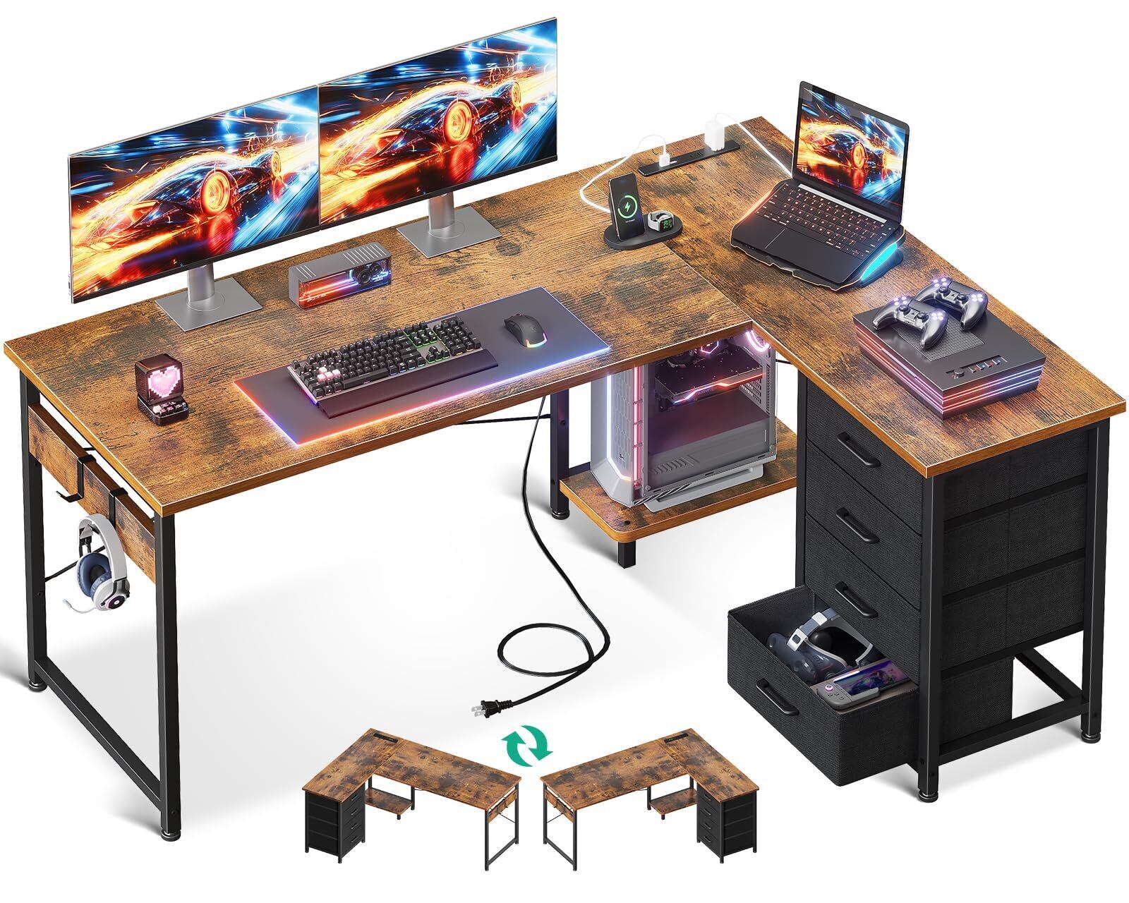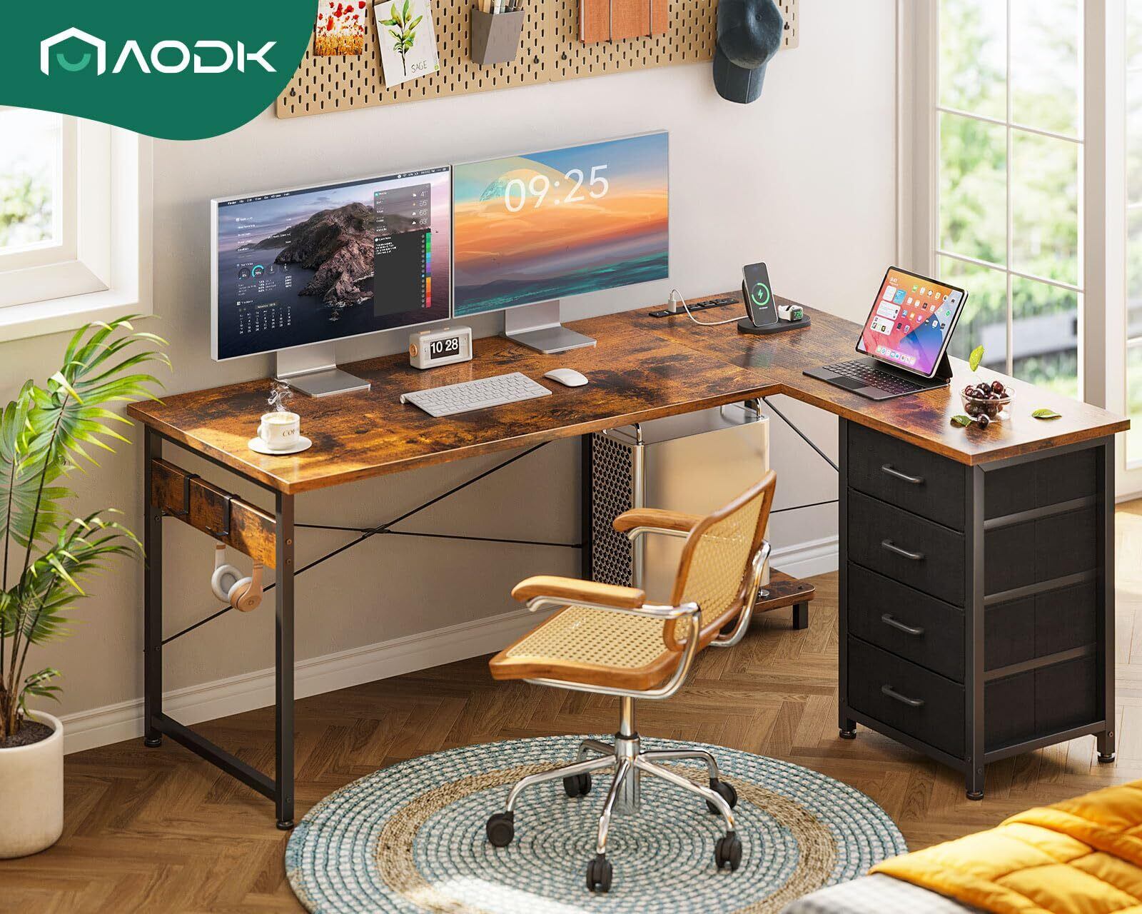AODK ゲーミングデスク 引き出し付き パソコンデスク コンセント付き l字デスク デスク 机 幅135*100 pcデスク 棚付き desk 収納 オフィスデスク 仕事用 在宅勤務 組立簡単 ビンテージ | kki