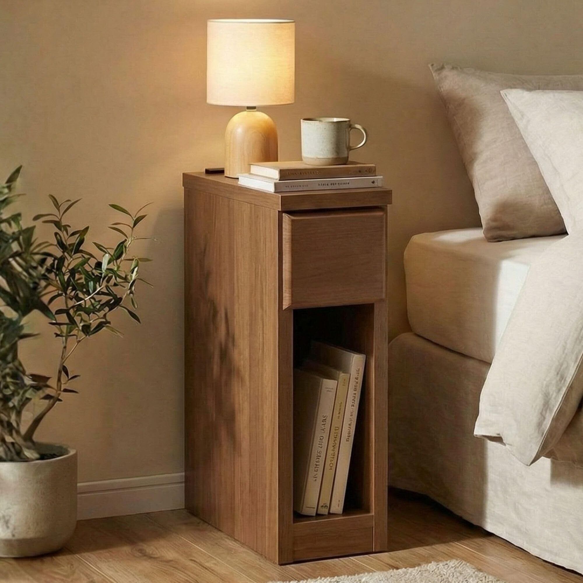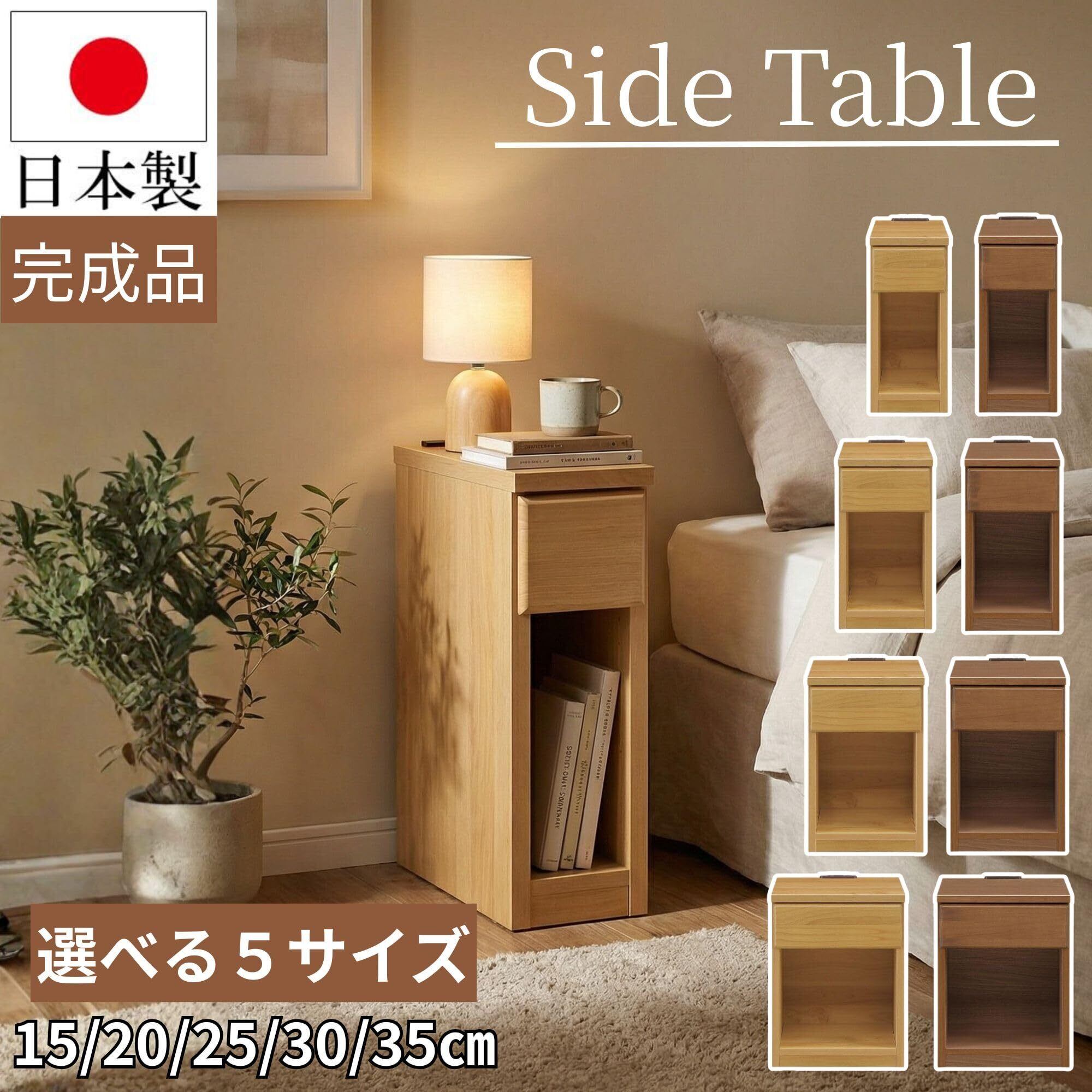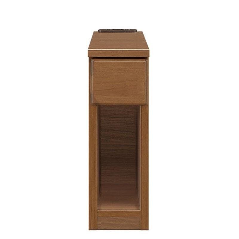 サイドテーブル ナイトテーブル ベッドサイドテーブル 大川家具 ベッド横 日本製 スキニ スリム ミニ コンセント付き 充電 引き出し 完成品 収納 棚 木製 寝室 リビング 薄型 隙間 収納 省スペース アルダー ブラウン 幅15cm | kki