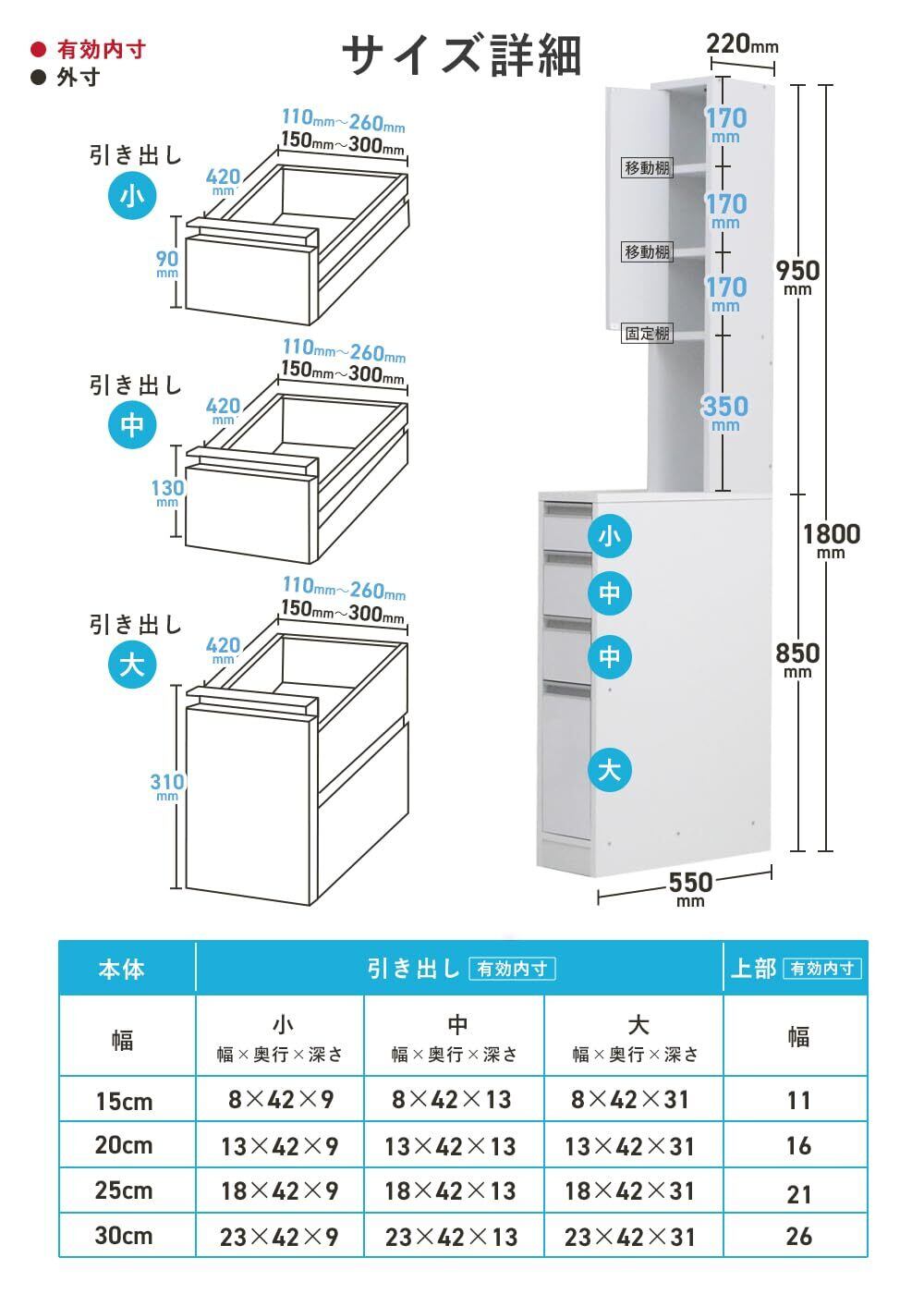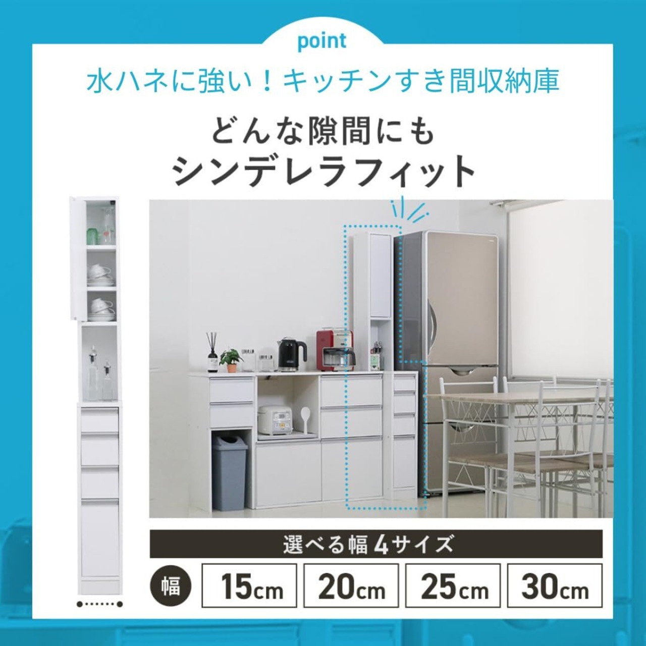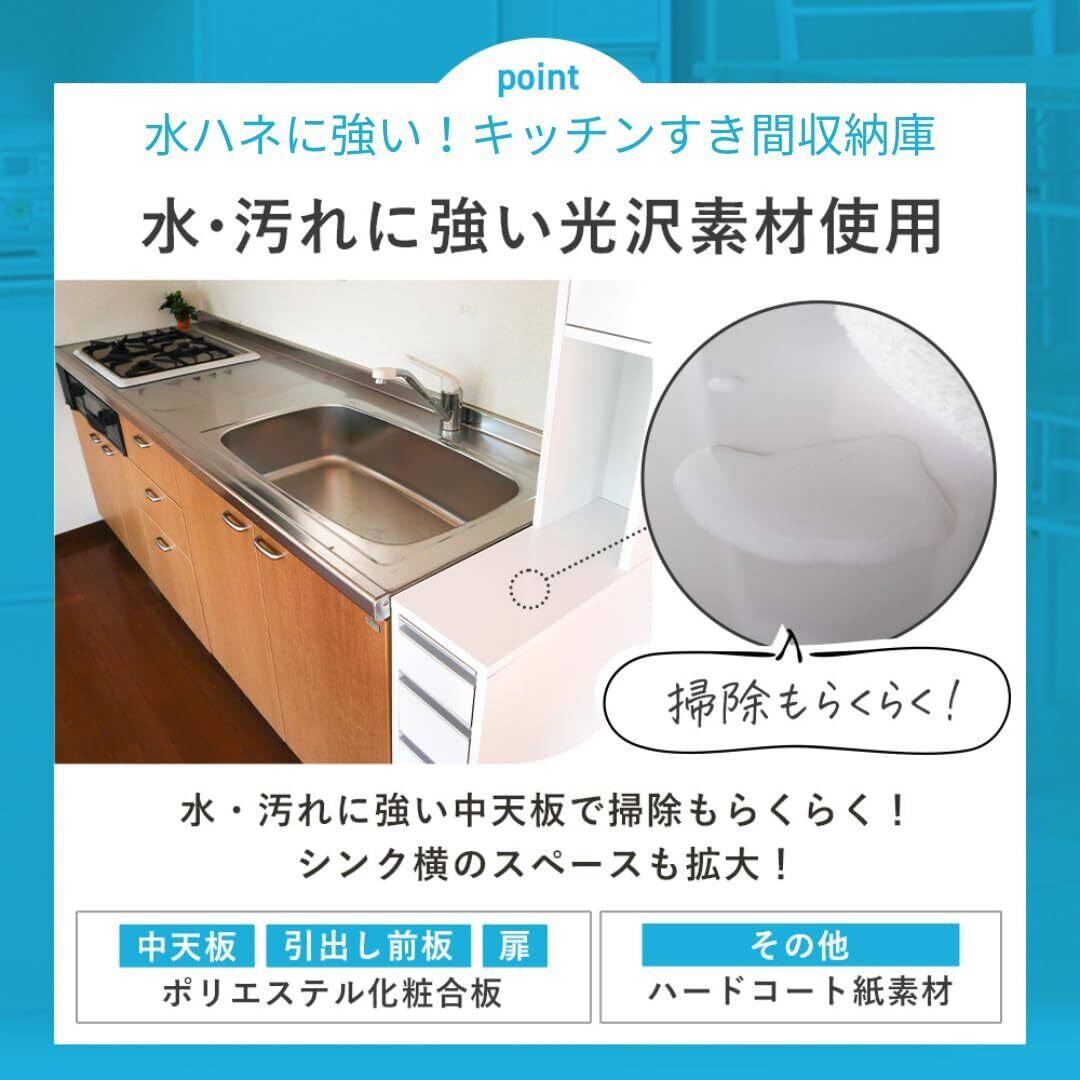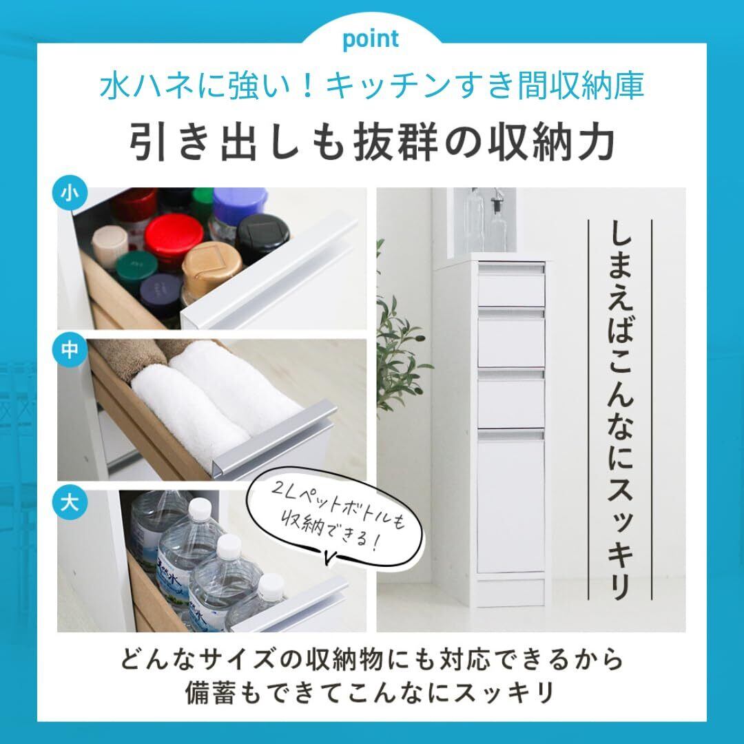 【国産】eco家具 水ハネに強いキッチンすき間収納庫 引き出し4杯 ホワイト 幅15cm 奥行55cm 高さ180cm