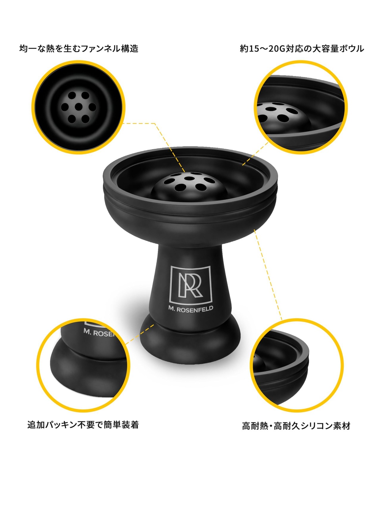 シーシャ ボウル シリコン 7穴 シーシャ シリコンボウル シーシャ ヒートマネジメント 対応 ファンネル型 約15〜20g大容量 耐熱・耐久シリコン製 落下しても割れにくい 追加パッキン不要 ユニバーサルサイズ ほとんどの水パイプ・シーシャ本体に対応 お手入れは水洗いで簡単 7穴でなめらかな気流 自宅用・商業用 マットブラック M. ROSENFELD | kki