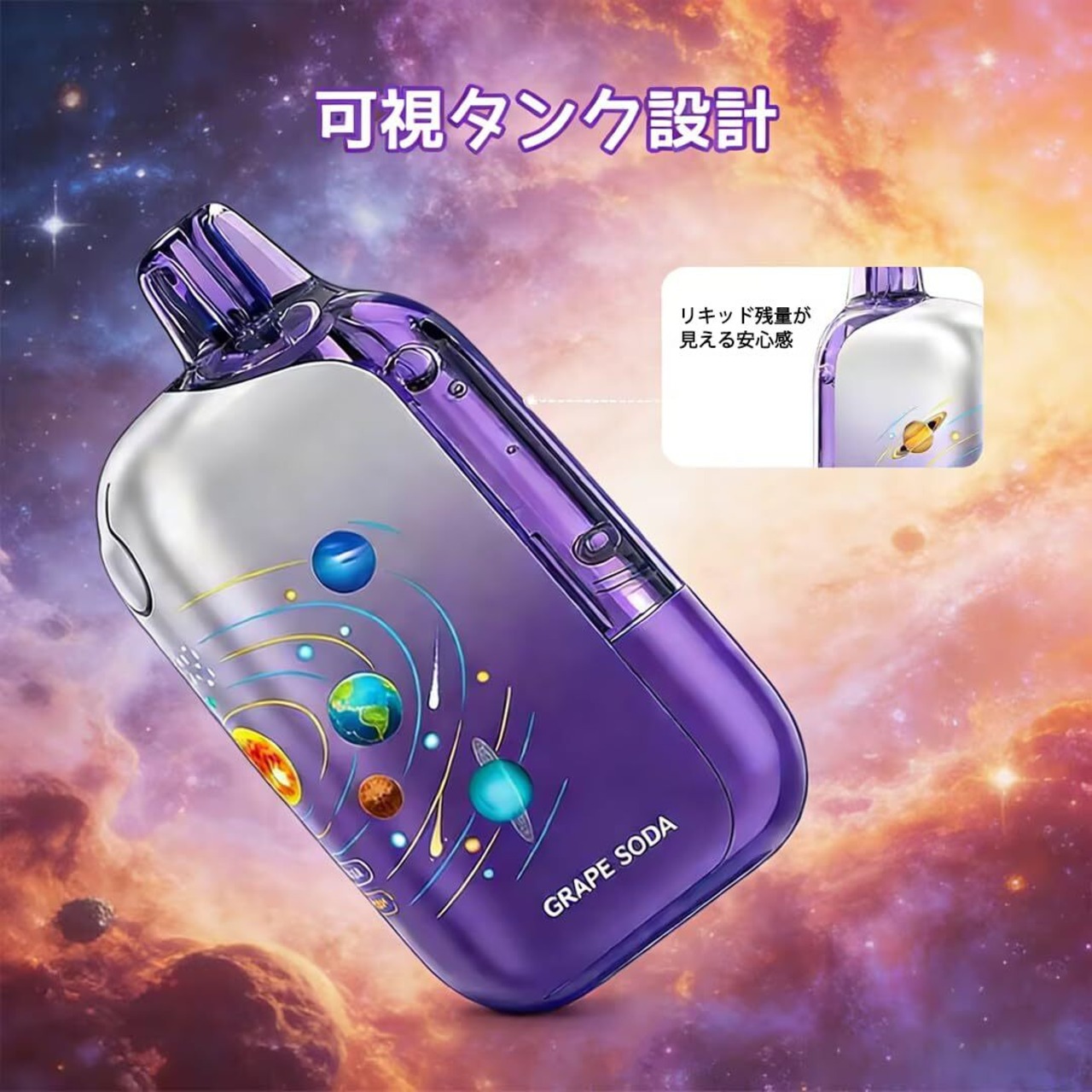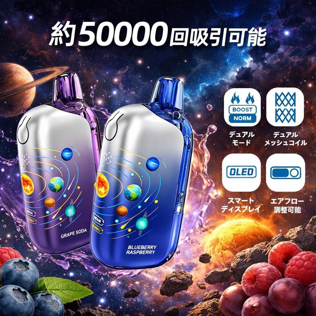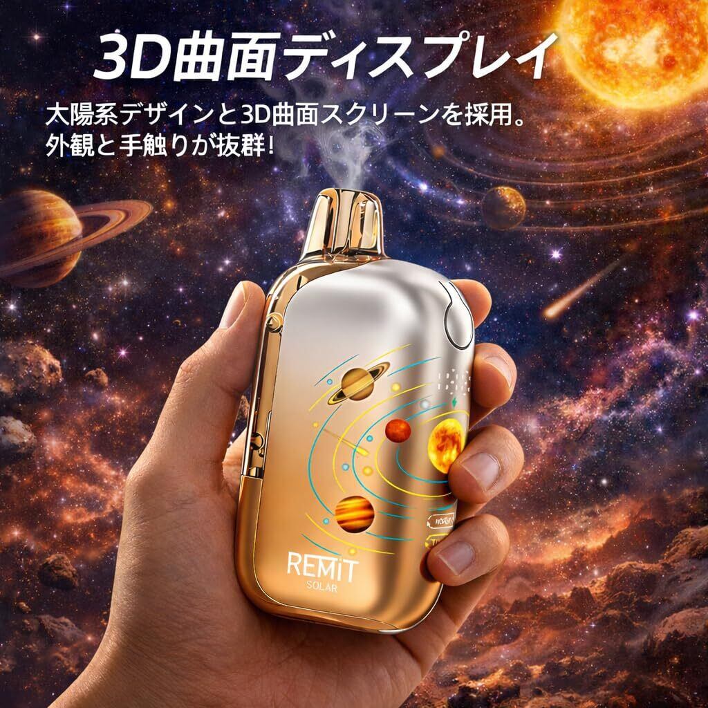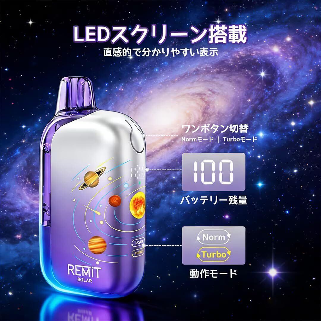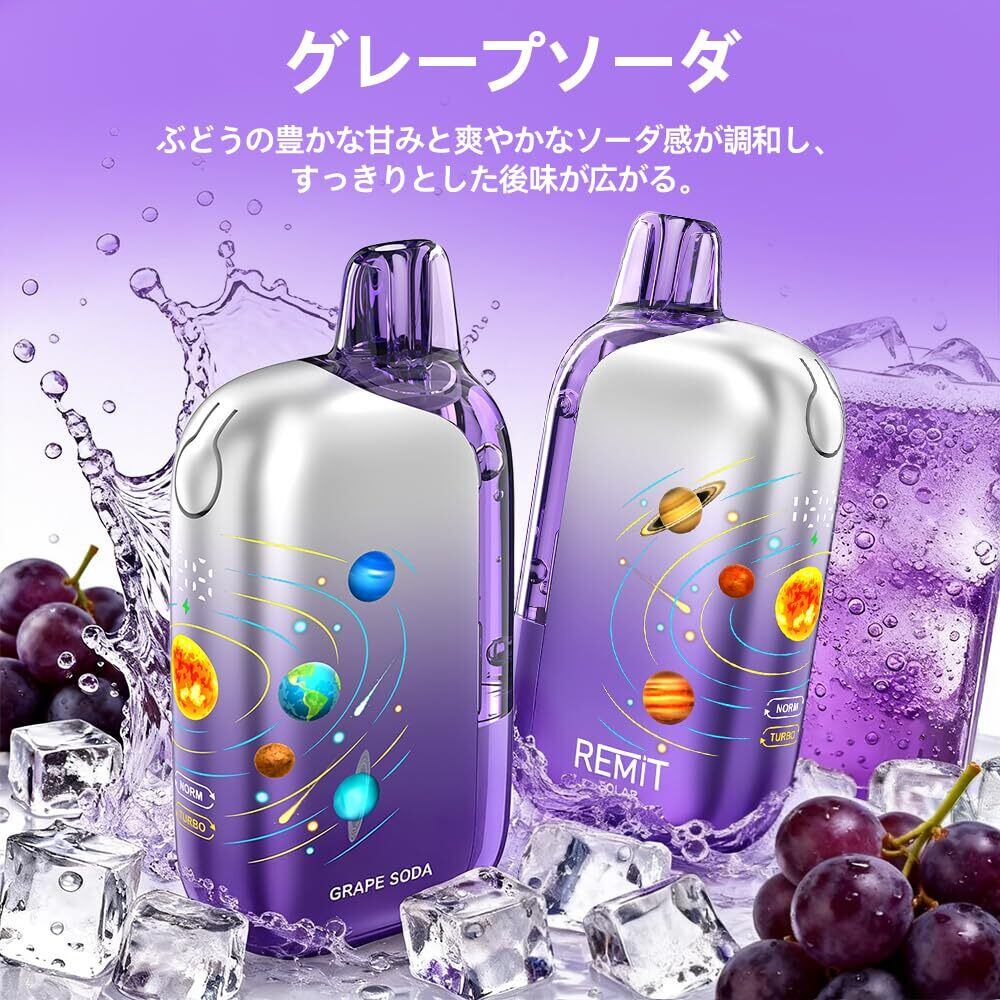 【50000回吸引可能】 Remit Solar 50K 電子タバコ ベイプ 使い捨て 50000回吸引 3D宇宙デザイン OLED大画面 爆煙 本体 水蒸気タバコ 禁煙パイポ 禁煙グッズ シーシャ 持ち運び 人気 850mAh 充電式 Type-C充電 ニコチン タール無し (グレープソーダ) | kki