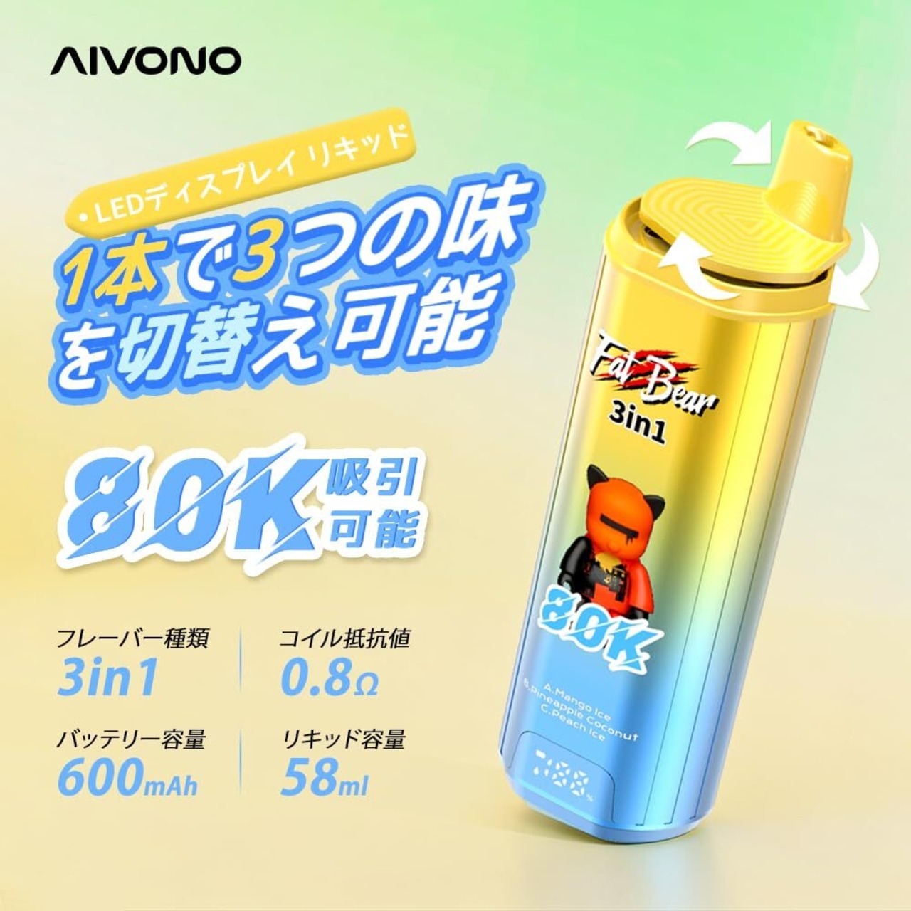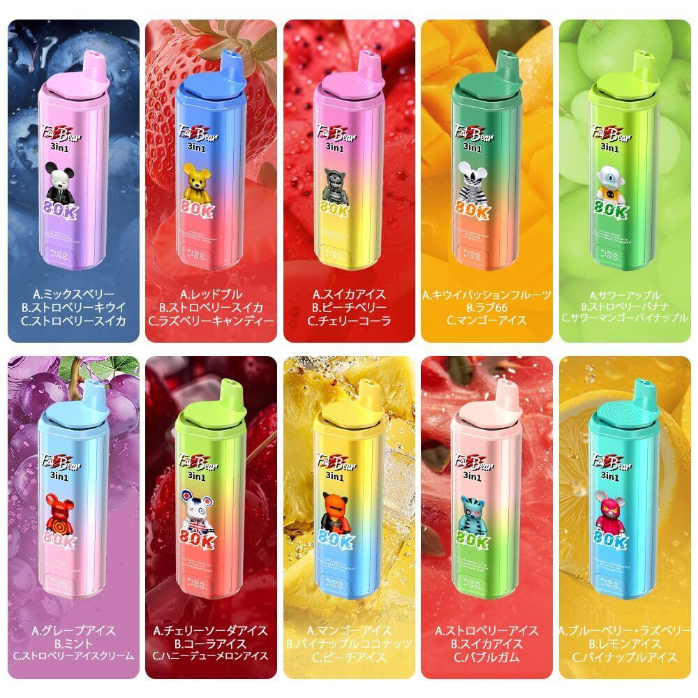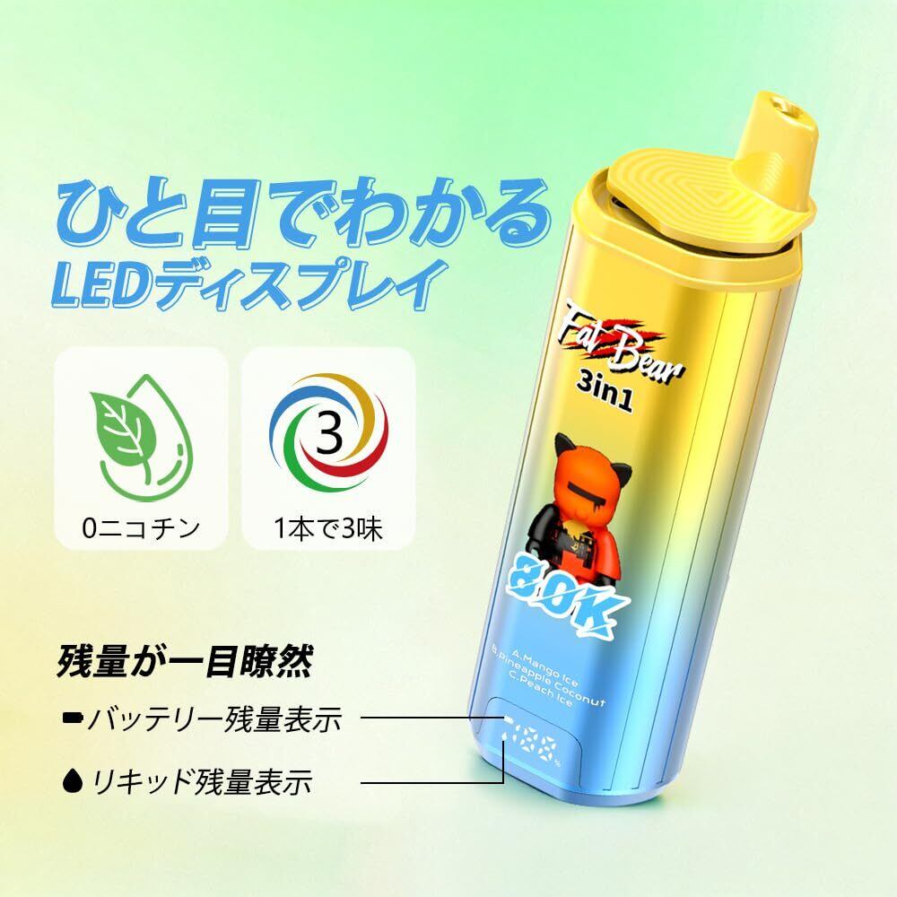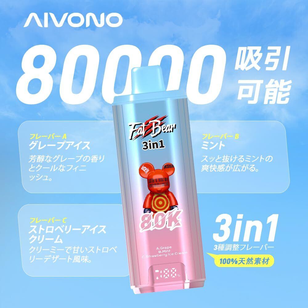 【80000回】3in1 使い捨て電子タバコAivono 80000 Puffs 大容量 650mAh Type-C充電 デュアルメッシュコイル LEDディスプレイ付き ベイプ ノンニコチン (グレープアイス + ミント + ストロベリーアイスクリーム) | kki