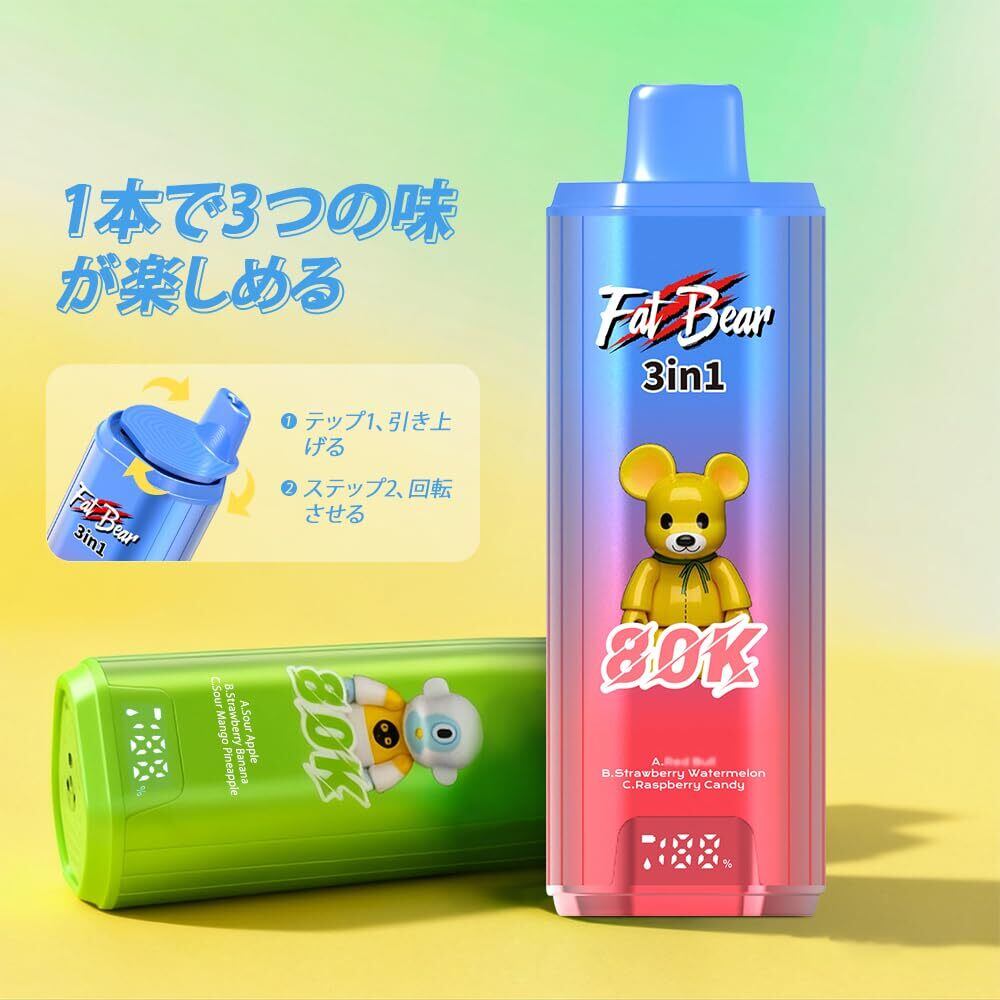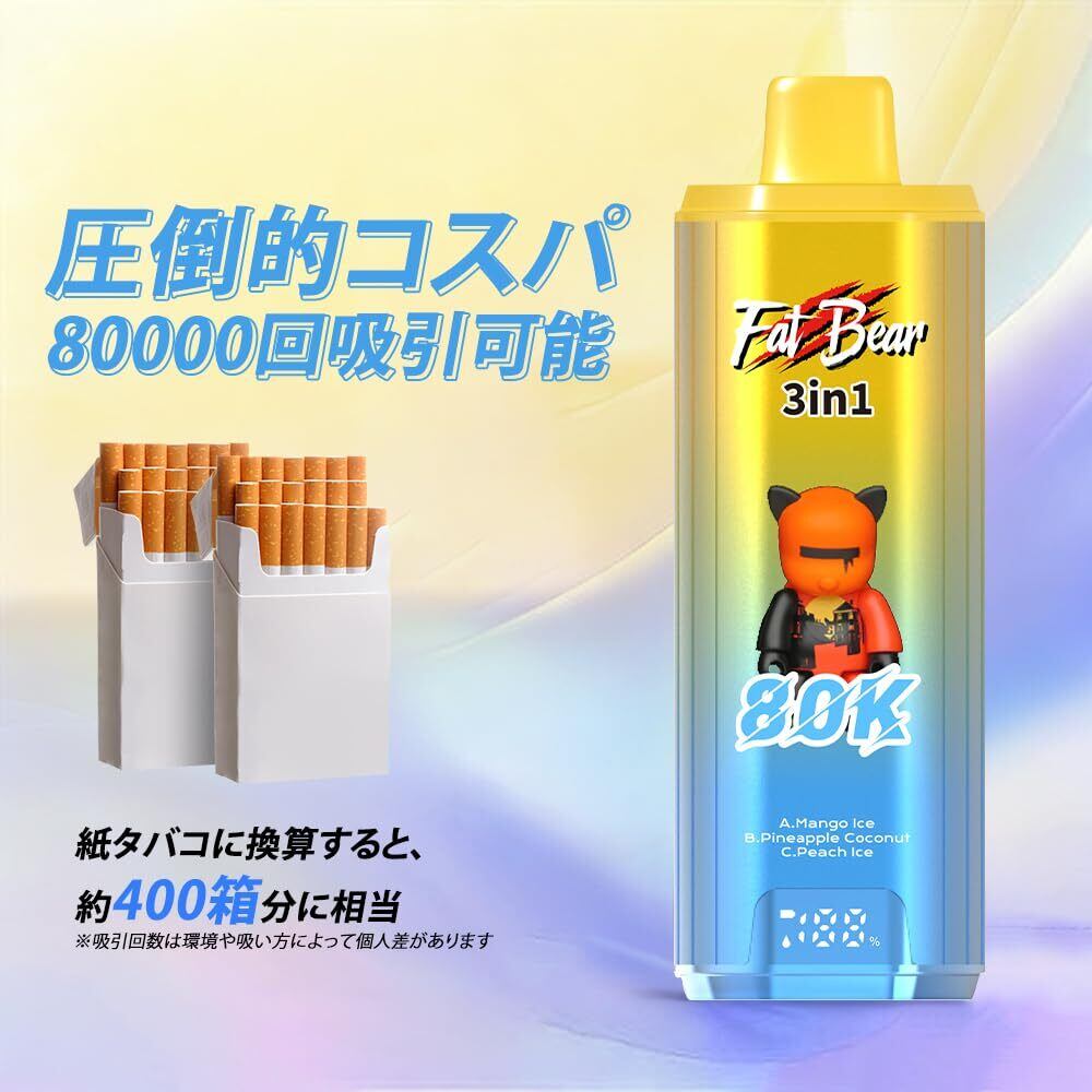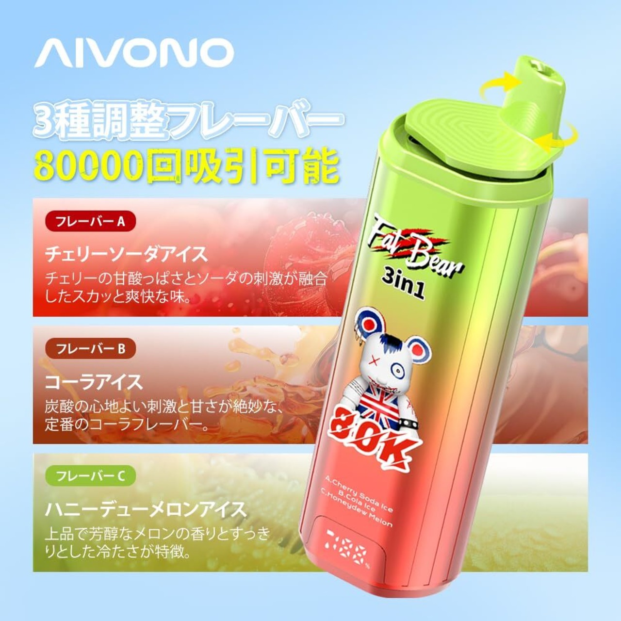 Aivono 80000 回使い捨て電子タバコ 58mL 大容量 650mAh Type-C充電 デュアルメッシュコイル LEDディスプレイ付き ベイプ ノンニコチン (Cherry Soda ice + cola ice +Honeydew melon ice) | kki