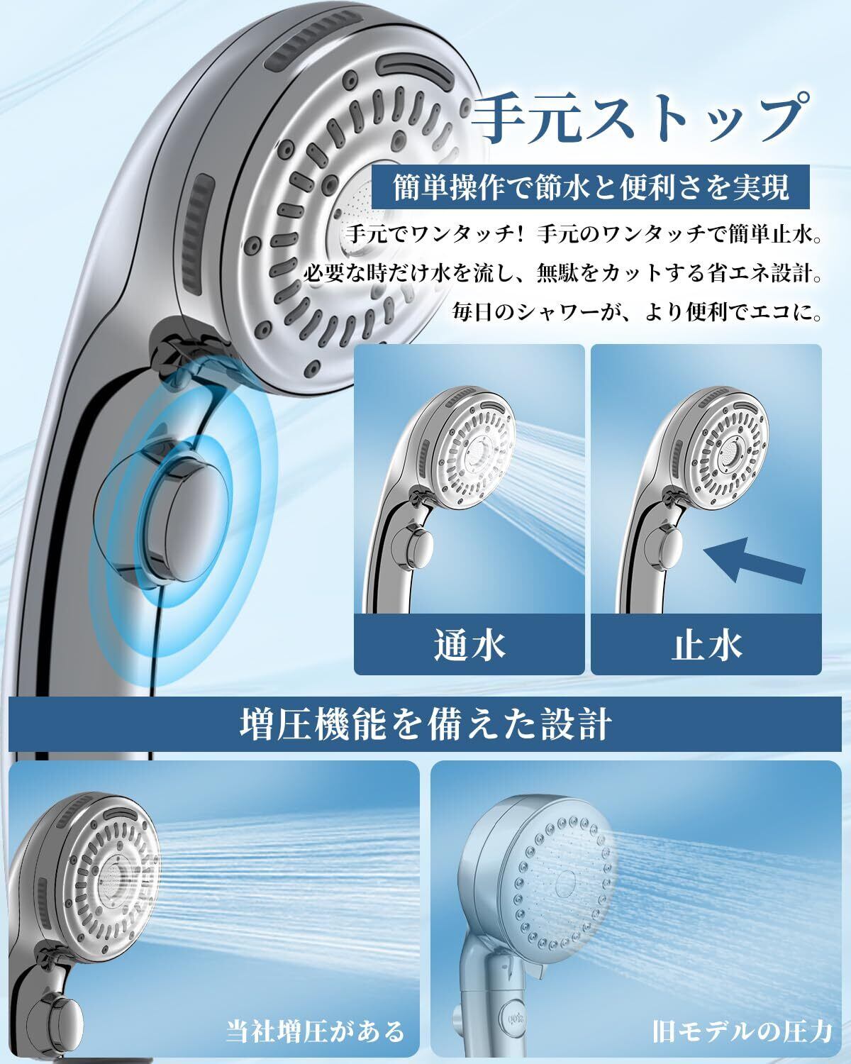 【高水压・節水80%・手元止水機能で経済的かつ環境に優しいシャワーヘッド】のシャワーヘッドは空気力学を活用し、水量を維持しながら水圧を増加。低水圧環境でも力強い水流を実現します。冷水と温水が混水弁に入る前に増圧装置を通過することで、水圧・水温・出水量が安定し、急な温度変化を防ぎます。独自開発の精密散水板を採用し、快適な使用感を保ちながら最大80%の節水を実現。水道代の大幅な節約に加え、ガス代や電気代にも優しい経済的な設計です。これにより、環境にも配慮したエコな暮らしをサポートします。さらに、手元のワンタッチ止水ボタンで簡単に水流のオン・オフが可能。給湯器の切り替えによる湯温・水温の変化を防ぎ、シャンプーやボディソープ使用時にも便利です。効率的に水を使い、一滴一滴を無駄にしない、快適で賢いバスタイムをお楽しみください!