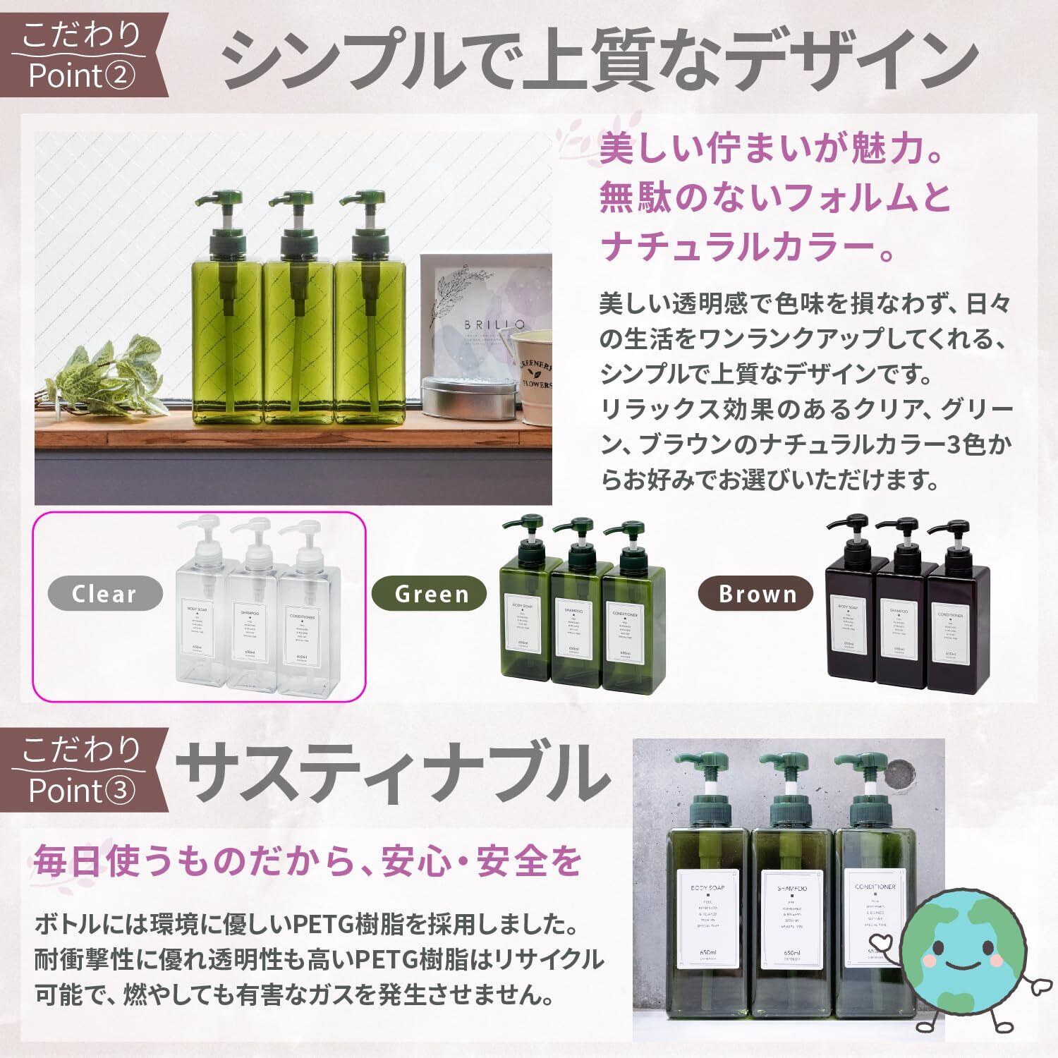 【650mLの大容量】シャンプーボトルが中途半端に残ってしまう悩みを解決する為に650mlまで入るようにしました。これにより、お徳用の詰め替えパックの他、市販で最も詰め替えタイプとして多い、330ml×2回分も入ります。 【押しやすさを追求】押しやすさを極めたポンプヘッド。1プッシュ3~4ml。何度も押すストレスも無く、無駄にしません。シンプルな形状なので安定感も抜群。手が濡れていたり、残量が減って軽くなってもグラつきにくいのもポイントの1つです。お子さんがいる家庭でも安心です。