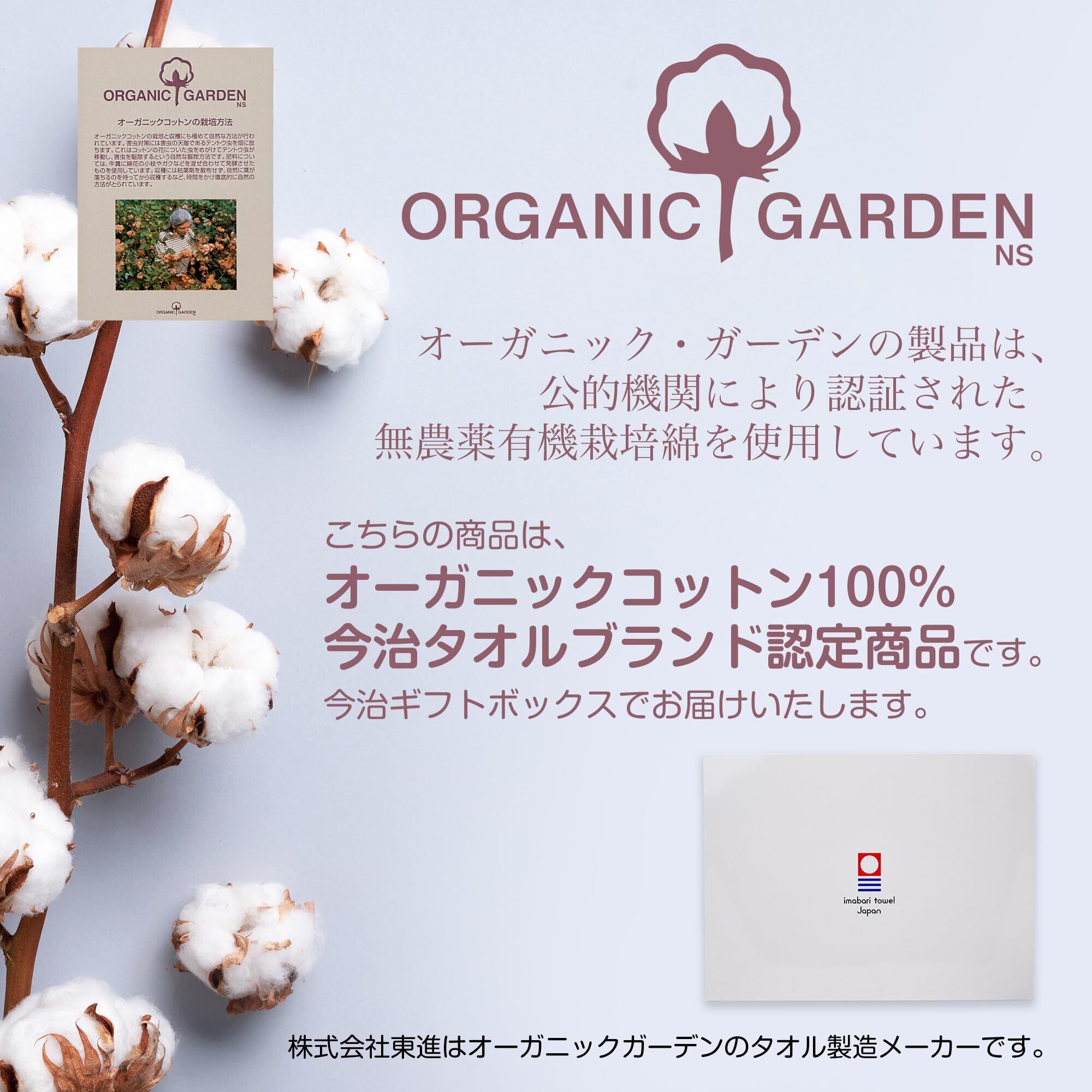 オーガニック・ガーデンの製品は、公的機関により認証された無農薬有機栽培綿を使用しています。こちらの商品はオーガニックコットン100%。今治ブランド認定商品です。今治ギフトボックスでお届けいたします。お祝いやギフトにそのままお使いいただけます。※株式会社東進は、オーガニックガーデンのタオル製造メーカーです。