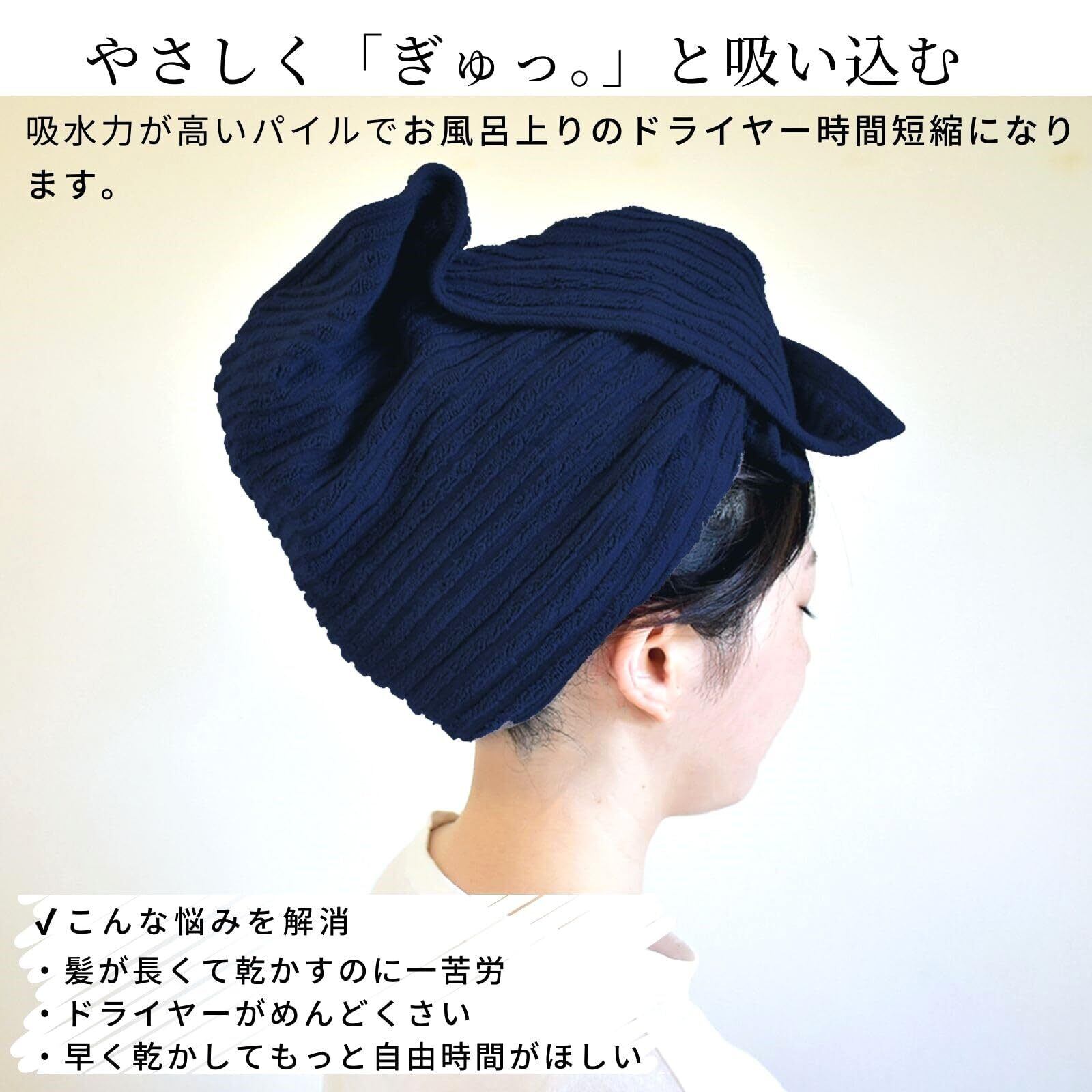ORI365 のびのびタオル 今治タオル ヘアドライタオル 2枚セット 伸びるタオル 吸水 速乾 綿 ドライキャップ 長いタオル 日本製 風呂上り フェイスタオル 頭に巻く ストレッチタオル 33×90cm 真空圧縮パック (ネイビー, 2) | kki