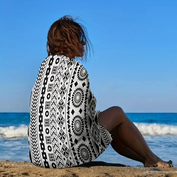 【商品】ビーチタオル 【サイズ】75×150cm オシャレな女性にぴったりのビーチタオルが登場!幾何学模様とエスニック柄が魅力的なこの大判タオルは、海水浴やプールで大活躍◎しっかりとした厚手の素材で、水分を瞬時に吸収してくれるので、ゴシゴシこすらずにサッと拭けます。肌に当てるだけでしっかり水を吸ってくれるから、濡れて気持ち悪い感覚もなく、最後まで快適に使えます このビーチタオルは、汎用性の高いアイテムです。大人はもちろん、お子様の湯上げ用タオルや赤ちゃんのおくるみとしても使用可能。また、旅行やソファー、オフィス、ベッド、車用など、多用途にお使いいただけます。おしゃれなデザインと機能性を兼ね備えたこのタオルは、あらゆるシーンで活躍 一年を通じて使える「ビーチタオル」は、夏場にはしっかりと汗を吸収し、冬場には暖かさを逃さず、快適に過ごせます。エスニック柄と幾何学模様がオシャレ心をくすぐり、ビーチやプールサイドで一際目立つこと間違いなし。このタオルで、スタイリッシュに夏のレジャーを楽しみましょう!