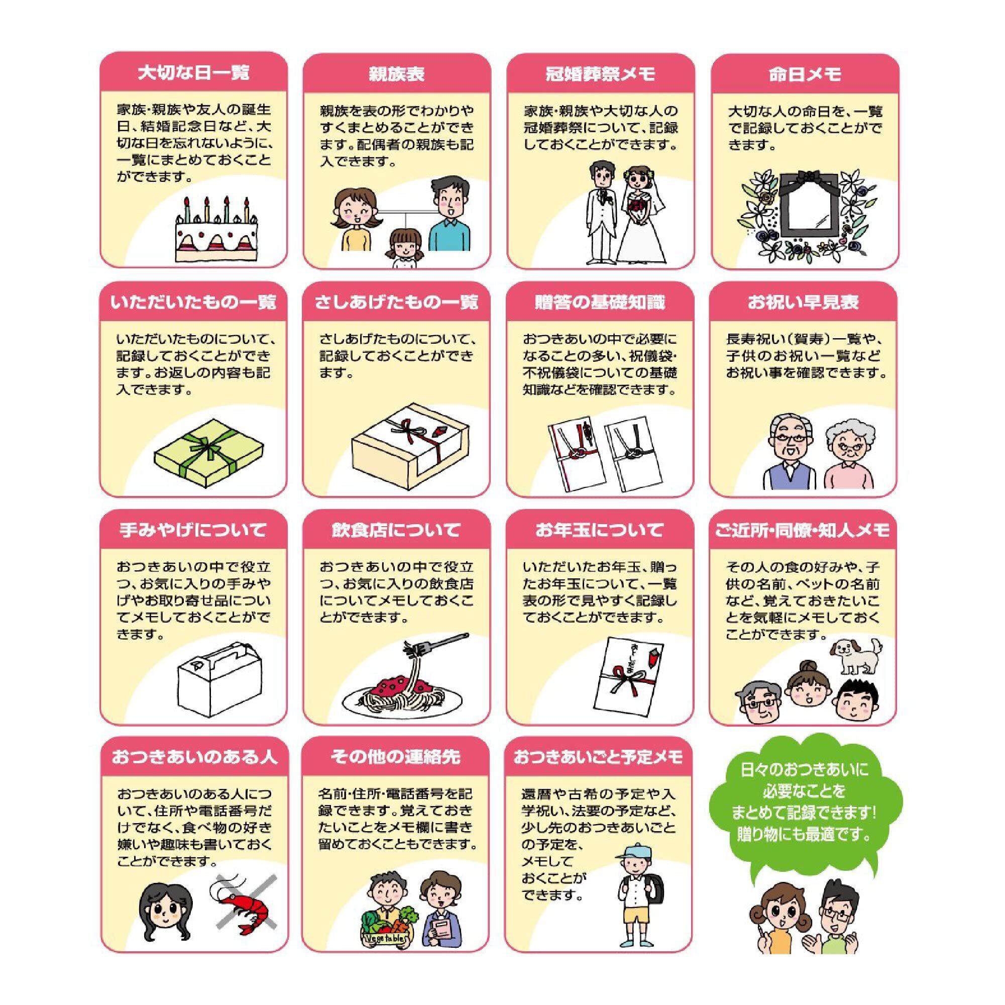・贈答記録、住所・連絡先、親族表、冠婚葬祭メモや命日リスト、お年玉、お気に入りのお店メモまでおつきあいに役立つ便利な項目を多数盛り込みました。