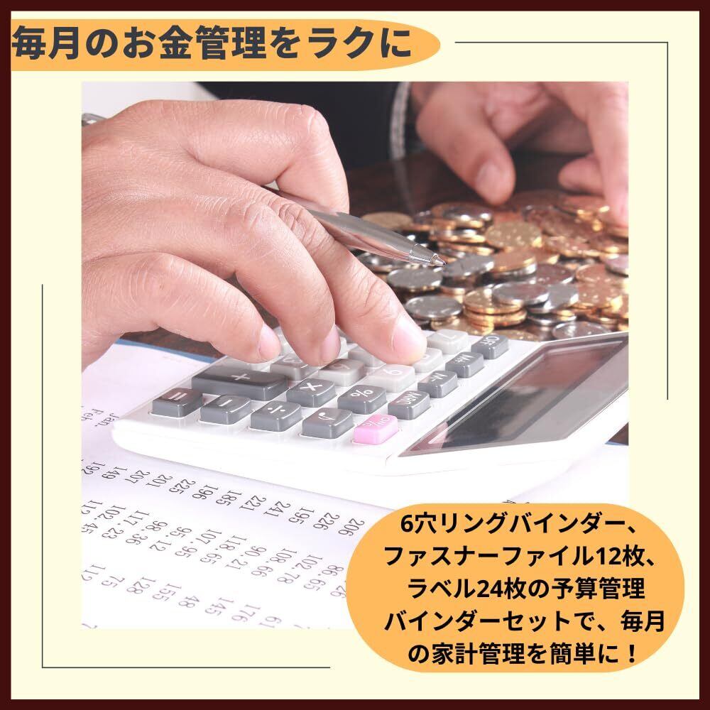 【大容量予算バインダー】手帳カバー(6穴リングルーズリーフバインダー)、ファスナー付きPVC素材のファイル12枚、ラベル24枚が含まれる。予算管理バインダー一式です。