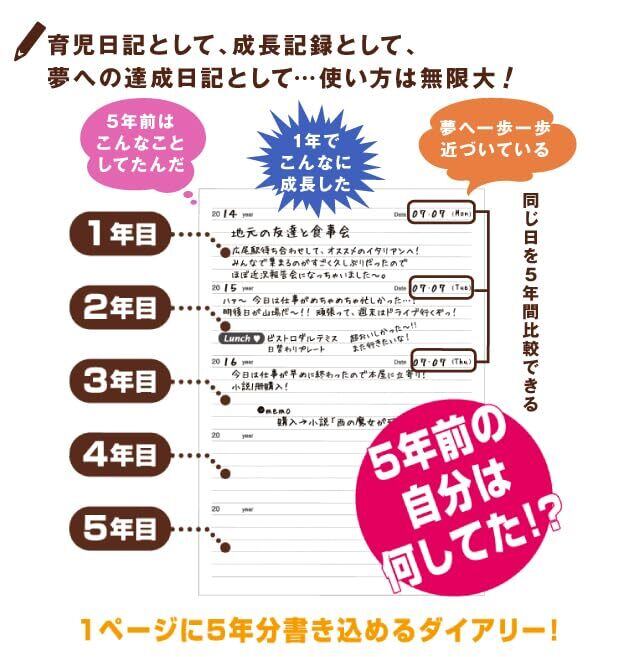 おすまし顔でちょこんと座ったネコちゃんがおしゃれでかわいい日記帳。日記を書きながら4年前~昨年の自分の成長がわかります日付書き込みタイプ5年間ダイアリー油性 。 5年間ダイアリー ・ゲルインクペンがおすすめです。(水性・万年筆は裏写りする可能性がございます)