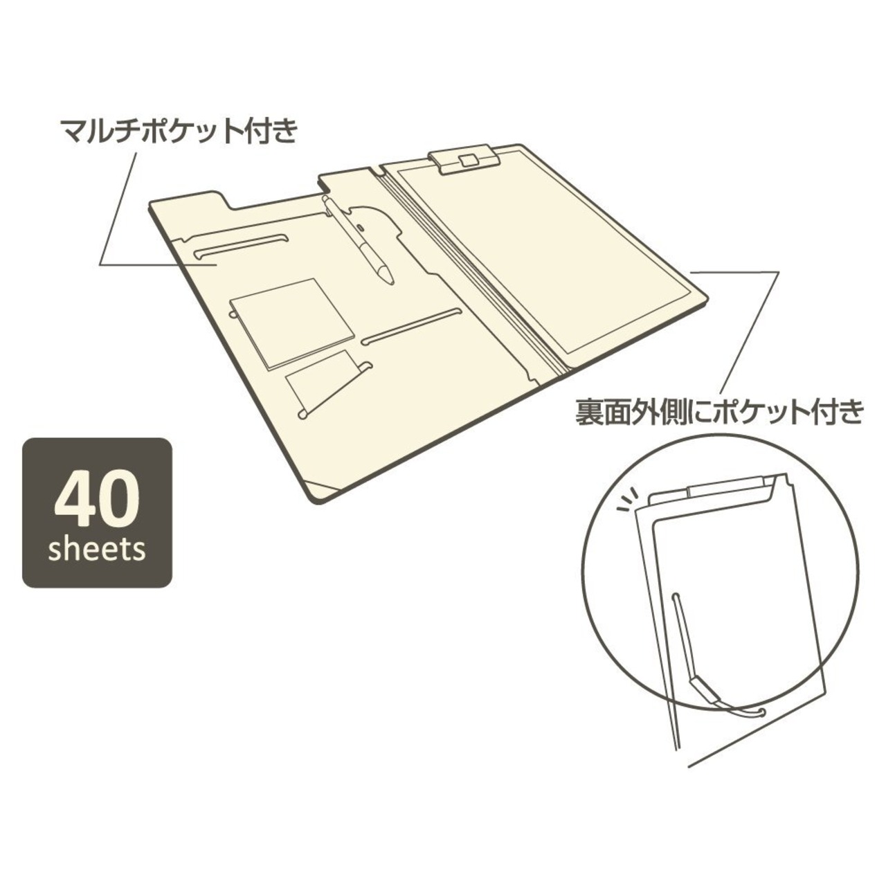 マルチポケット&外側ポケットがついて、一時保管や書類の分類がしやすいクリップファイル。裏面外側にポケット付き。
