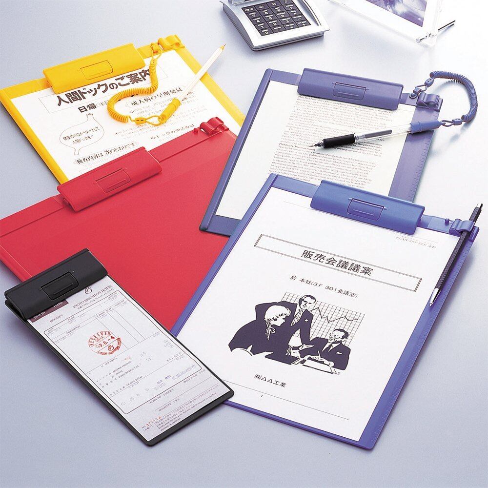 片手で簡単にオープン&ロックできるユニバーサルデザイン・クリップボード。●クリップは開いた上体でストップします。用紙を挿入し、クリップ中央のレバーを押せば簡単に閉じるユニバーサルデザイン商品。●ボード面は、書きやすいエンボス加工をしています。