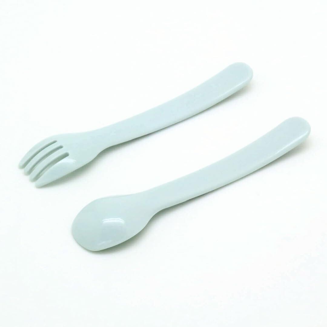 赤ちゃんの小さな手でも握りやすいスプーン&フォークのセット。