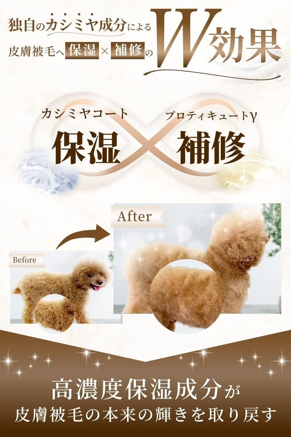 【独自のカシミア由来成分のW効果が“極ふわ感”を実現】提携の国内工場と厳選した2種類の成分が、毛のキューティクルの「補修」「バリア機能の強化」を行います。またベースとして使用している高還元性イオン水が持つ「デリバリー作用」のより皮膚被毛への浸透率を高め、「保湿」を促進します。