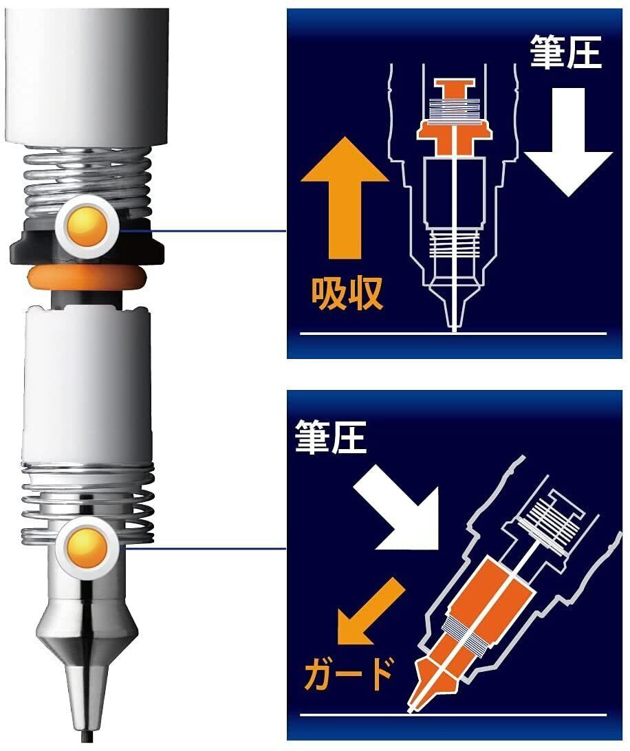 スペーサーの搭載により、隙間を埋めることで、芯づまりを防ぐ。今までのシャープペンでは、落下などの外部からの衝撃によりシャープメカ内部で芯が折れたり芯がずれることで、芯づまりが起きていた。この問題をスペンサーにより解決、だから、もう詰まらない