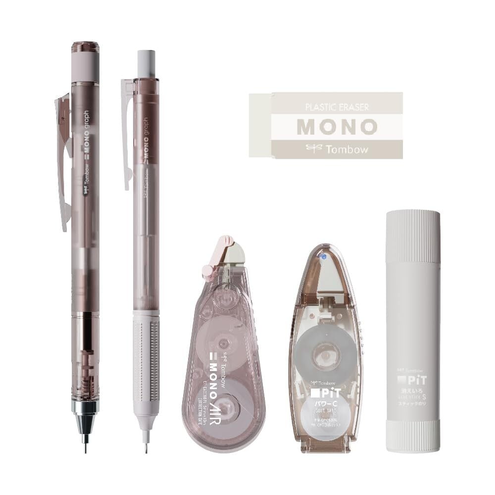 トンボ鉛筆 MONO × PiT 文房具セット パステルグラス ブラウン 6点セット (シャーペン0.5mm×2本 消しゴム スティックのり 修正テープ テープのり) PCC-644BAZ | kki