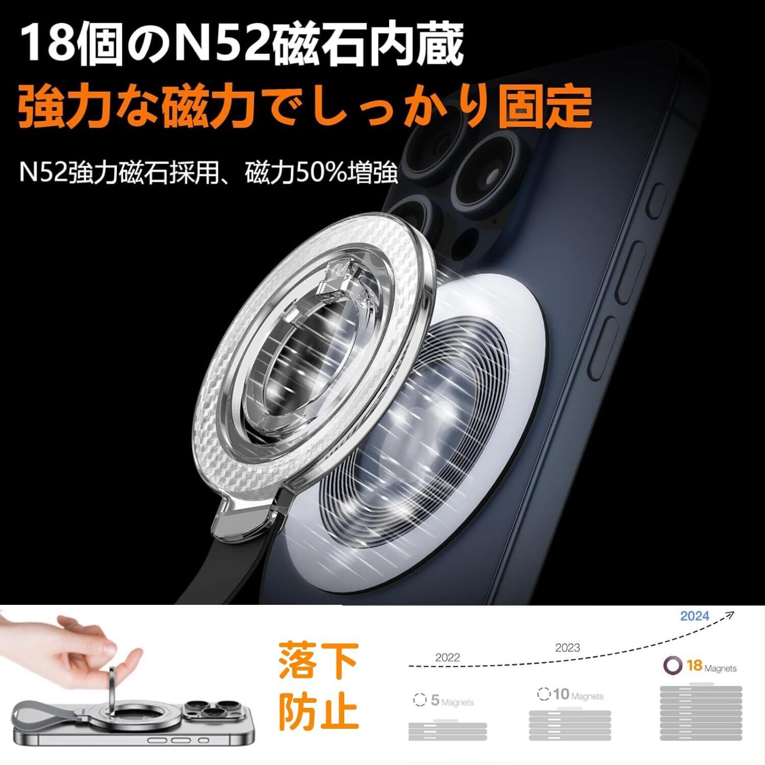 【両面マグネットで超便利&超強力な磁力】本製品は両面マグネット式で、業界最高レベルのネオジム磁石「N52」を内蔵し、最大1500gの磁気吸引力を持ちます。スマホをしっかり吸着し、落下の心配がありません。iPhone Mag Safe対応シリーズ本体やMag Safe搭載ケースに簡単に装着でき、マグネット式の車載ホルダー、冷蔵庫、ジムの設備など磁力のあるものにしっかりと吸着。さらに、付属のメタルリングを使えば、磁力のない場所でも取り付け可能です。キッチンやお風呂の壁、外出先など、どこでも両手を解放して、スマホでの動画視聴や撮影を楽しめます。多用途に活用でき、様々なシーンで活躍します。取り外しも簡単で、跡が残らないのも嬉しいポイントです。