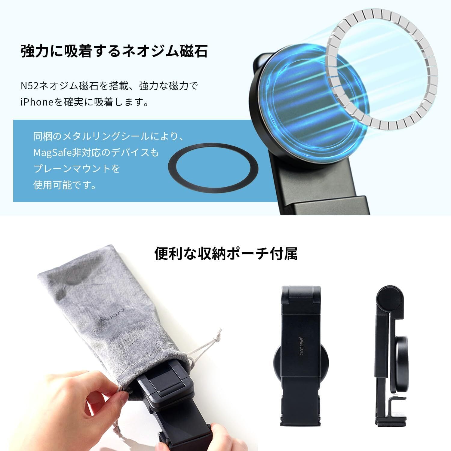 araree プレーンマウントM スマートフォン用 マウント Magsafe 対応 [ 強力磁力 ネオジム磁石 スタンド機能 クランプ式 持ち運び 片手持ち 360度回転 角度調節 メタルリング付属 動画撮影 iPhone Android用 ] AR26734 【国内正規品】