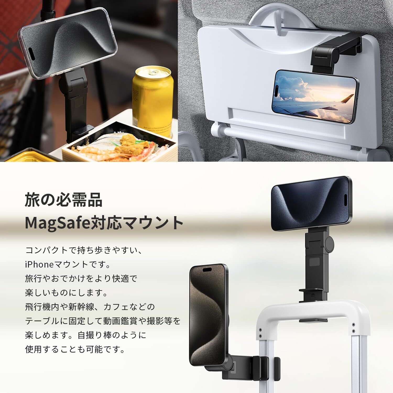 【旅の必需品MagSafe対応マウント】持ち歩きやすい、iPhoneマウントです。旅行先の持ち運びや、テーブルに固定したり多様なシーンで活躍。