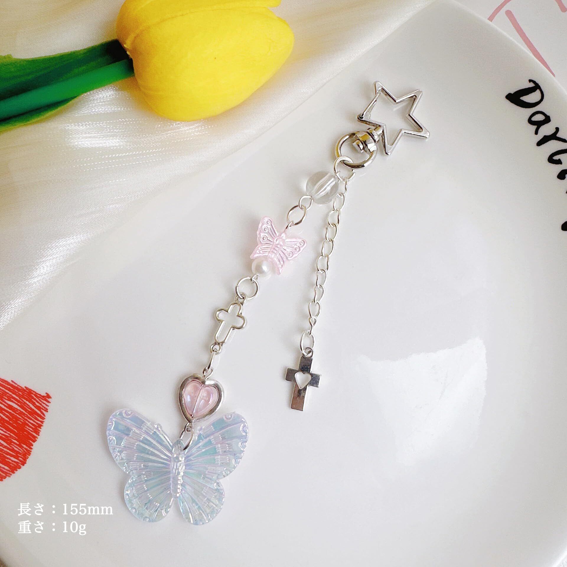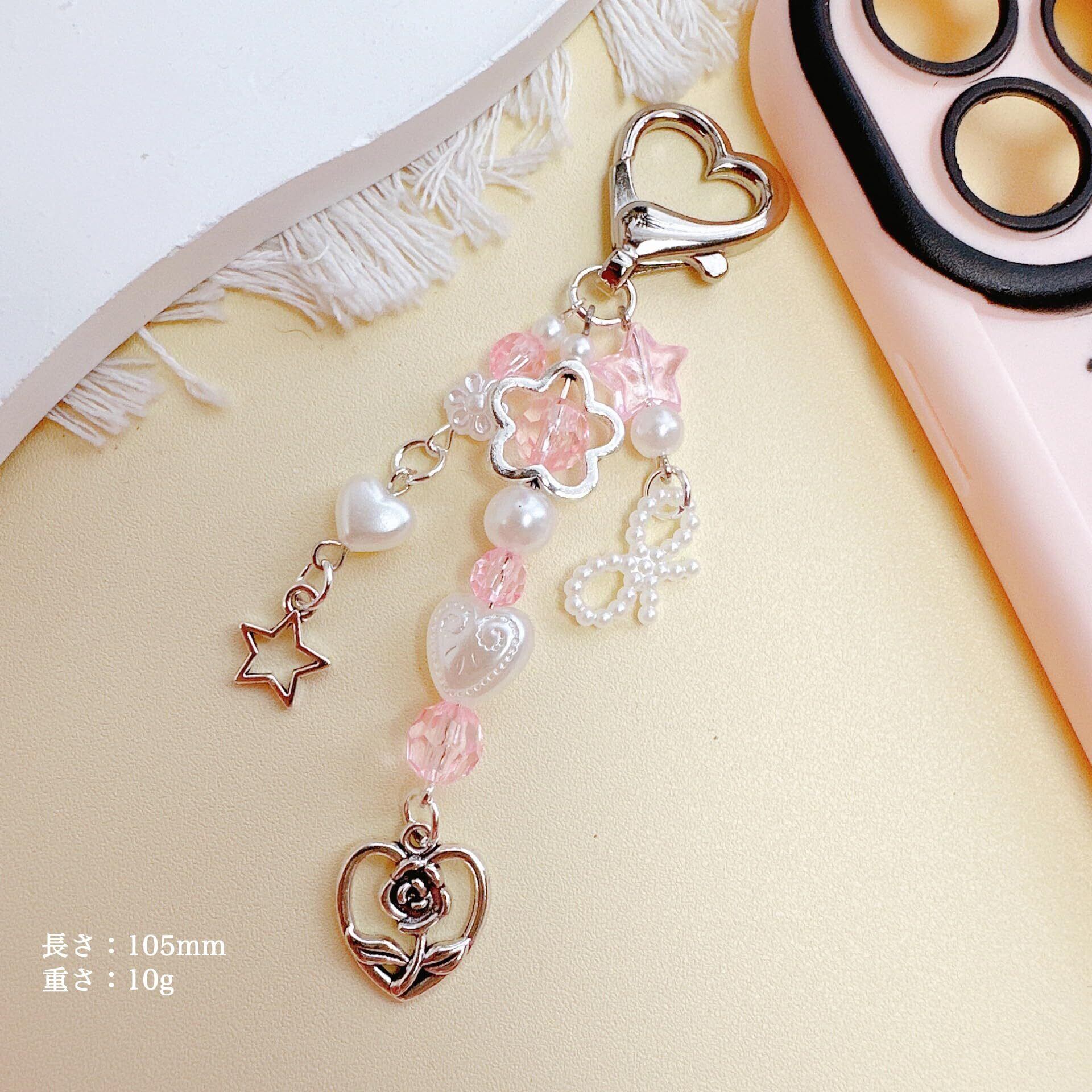 【おっしゃれなY2Kデザイン】4つの可愛い携帯ストラップが付属します。1 x ピンクの蝶と星のデザインの携帯ストラップ、1 x ピンクのイチゴとハートのデザインの携帯ストラップ、1 x 黒い蝶と星のデザインの携帯ストラップ、1 x スタータッセルペンダントの携帯ストラップ。長さ:14~15cm