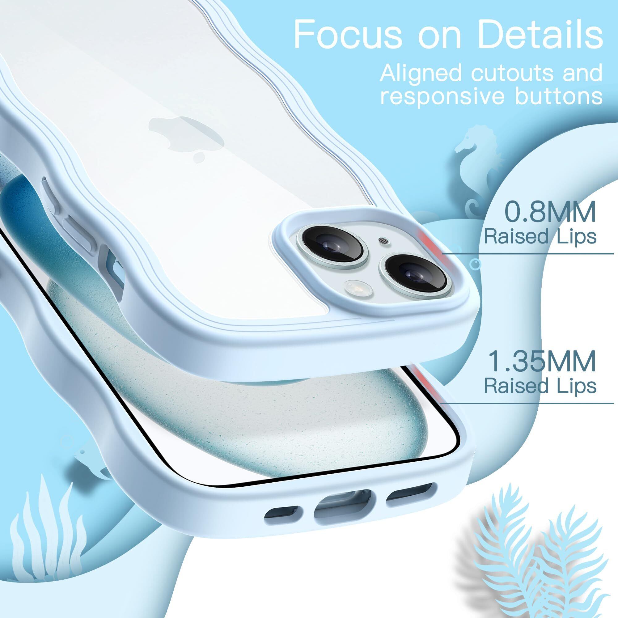 JEDirect iPhone 15 6.1インチ用 かわいい ケース 波状フレーム うねうね 耐衝撃 スマホカバー 女性用 女子向け クリア ハードPCバック (ブルー)