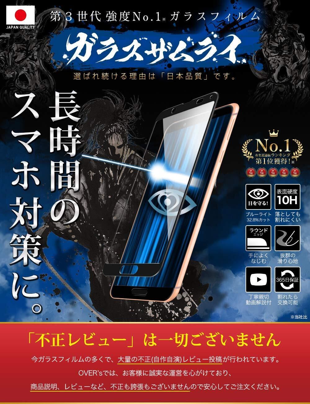 ガラスザムライ AQUOS sense3 用 ガラスフィルム SH-02M 用 SHV45 用 Android One S7 用 ブルーライトカット 全面保護 硬度 10H 強化ガラス 241-blue-3d-bk | kki